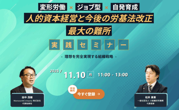 NEW 2025年11月10日ChatGPTなど生成AIと人的資本経営・人材戦略forestconsulting1@gmail.com 変形労働 × ジョブ型 × 自発育成―人的資本経営と労基法改正を見据えた実践セミナー Mamasan&CompanyiU組織研究機構 代表理事の松井勇策が、Mamasan&Company株式会社 代表取締役の田中茂樹氏とともに、「変形労働 × ジョブ型 × 自発育成」をテーマに、人的資本経営と今後の労働基準法改正に備える実践セ […]