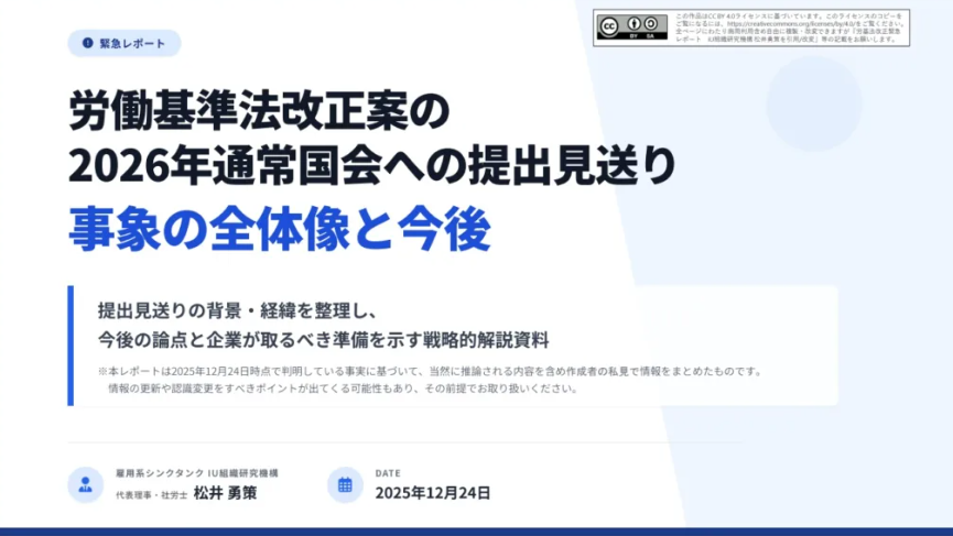 2025年12月25日 / 最終更新日 : 2025年12月28日 forestconsulting1@gmail.com 最新ニュース 緊急レポート「労基法改正案の、2026年通常国会提出見送り 事象の全体像と今後」について iU組織研究機構 代表理事の松井が、緊急レポート「労基法改正案の、2026年通常国会提出見送り 事象の全体像と今後」を作成、労基法大改正 戦略コンソーシアム特設サイトに掲載しています。 記事の詳細はこちら→ https://i-usoshiki.jpnx.org/roukihou-s/?p=805